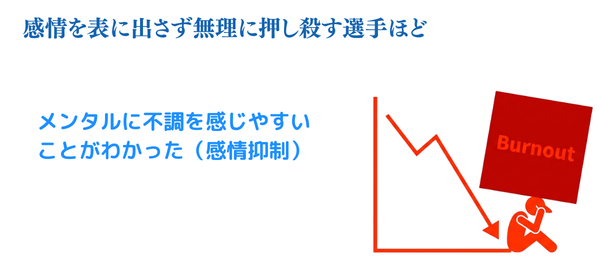まず、感情を表に出さず、無理に押し殺す選手ほど、メンタルに不調を感じやすいことがわかりました(感情抑制)。