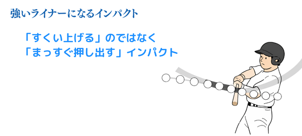 これは、ボールをバットの面で「すくい上げる」のではなく、「まっすぐ押し出す」インパクトといえます。