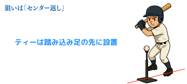 今回の狙いは「センター返し」です。ティーは踏み込み足(前足)の先に設置してください。