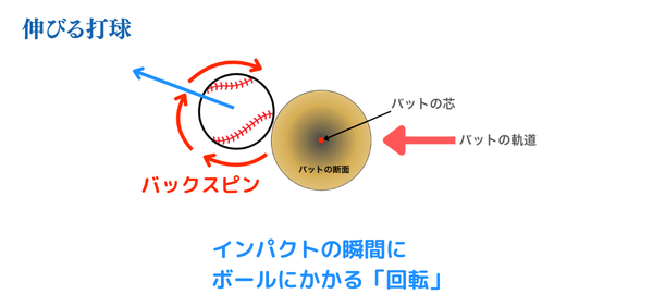つまり、強いライナーやフライは、このバックスピンが生み出す「浮き上がる力」によって生まれているんです。
