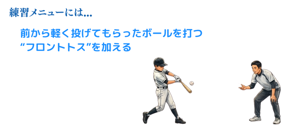 練習メニューには、前から軽く投げてもらったボールを打つ「フロントトス」を加えることをおすすめします。