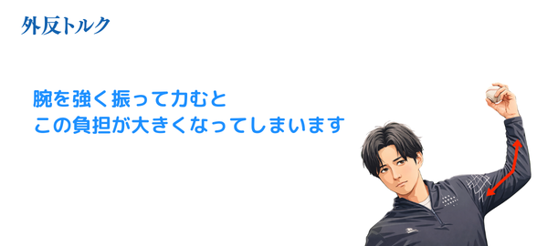 投球時にヒジの内側にかかる負担を「外反トルク」と呼びます。腕を強く振って力むと、この負担が大きくなってしまいます。