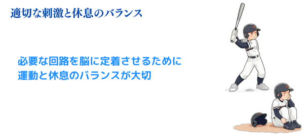 お子さんがバットを振っていない睡眠中やリラックスしている時間にも、脳は練習で得た情報を自動的に整理しています。そして、それを長期記憶として保存していくんです。